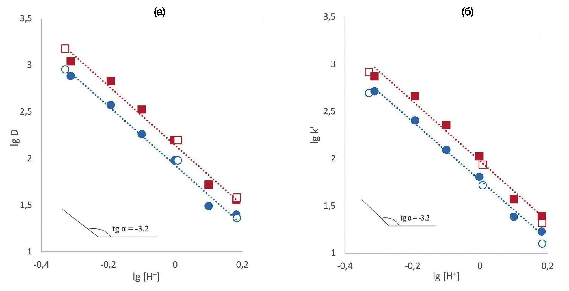 По аналогии с работой [14] значения массовых коэффициентов распределения конвертировали в объемные коэффициенты распределения DV, после чего был рассчитывали фактор удержания k' по формулам (2) и (3):