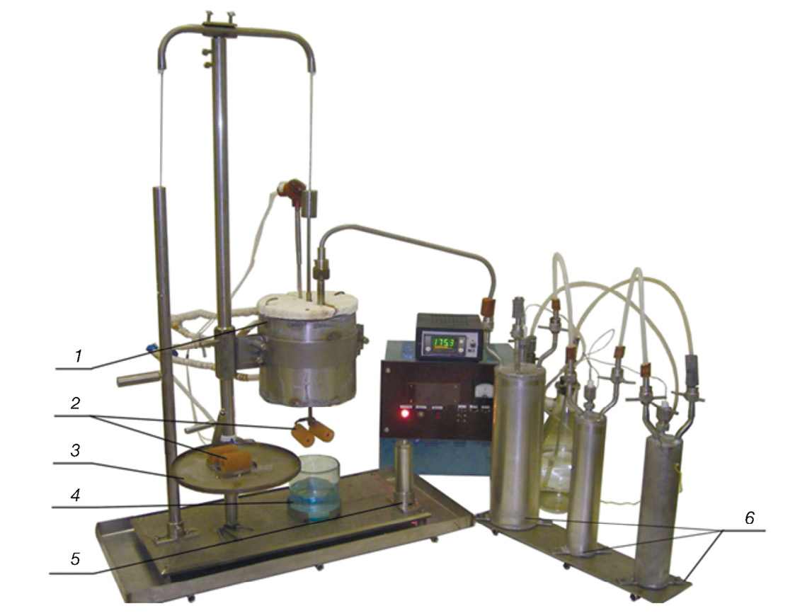 Рис. 3. Установка «ПОРА» для отработки процесса с раствором модельного реэкстракта цезия. 1 – электрическая печь; 2 – два блока ПНМ; 3 – поворотное дно печи с двумя блоками ПНМ; 4 – емкость с реэкстрактом Cs; 5 – пенал для двух блоков ПНМ, насыщенных CsNO3; 6 – система газоочистки (набор из трех барботеров-конденсаторов).