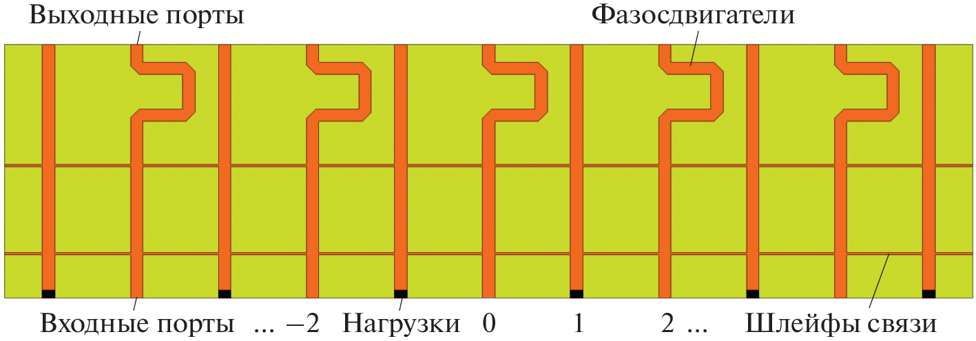 Рассмотрена микрополосковая диаграммообразующая схема, предназначенная для формирования секторной диаграммы направленности линейной антенной решетки. Предложен приближенный метод синтеза устройства, включающий анализ бесконечной периодической системы связанных микрополосковых линий. По найденным обобщенным параметрам структуры выбраны конструктивные параметры схемы. Проведен в системе HFSS ее электродинамический анализ, рассчитано в полосе частот формируемое в выходных каналах амплитудно-фазовое распределение. Разработан, изготовлен и экспериментально исследован образец устройства, обеспечивающий в полосе частот до 80% формирование требуемого амплитудно-фазового распределения. На основе полученных экспериментальных данных в системе HFSS проведено моделирование диаграммообразующей схемы с линейной решеткой рупоров и показано, что элементы такой решетки имеют диаграммы направленности близкие к прямоугольным.