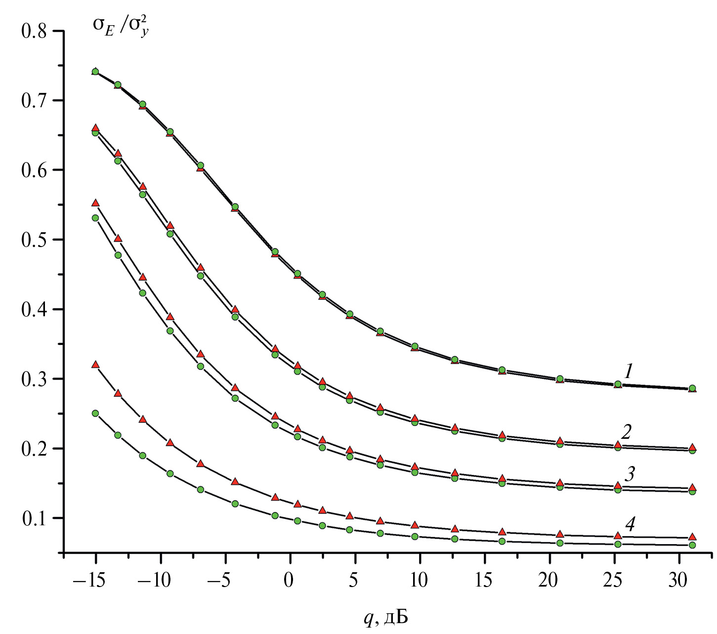Рис. 6. Девиация флуктуаций корреляционного эффекта в зависимости от отношения сигнал/помеха q в канале при различной базе B для сигналов с прямоугольным спектром (кривые c треугольниками) и сигналов с временным окном (кривые с кружочками): В = 50 (1), 100 (2), 500 (3), 1000 (4).