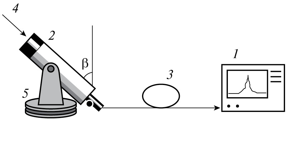 В качестве измерителя спектрального состава, прошедшего сквозь атмосферу солнечного света 4 (рис. 1) был использован оптический анализатор спектра 1, волоконный коллиматор 2 с диаметром входного зрачка ~1 см, который принимал свет и с помощью волоконного кабеля 3 направлял излучение на входной разъем анализатора спектра. Система наведения состояла из опорно-поворотного устройства 5 по азимуту и углу места с точностью отсчета угла не хуже 0.5°.
