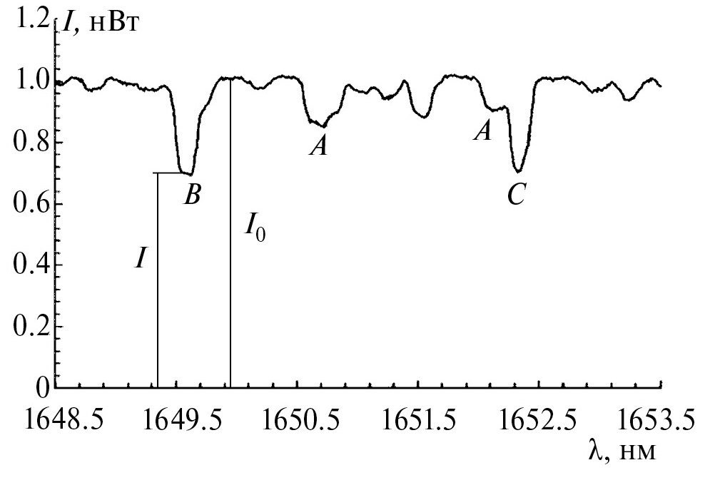 где N₀ – количество молекул в единице объема (N₀ = 2.6875 × 10²⁵ м⁻³ – число Лошмидта), – поперечное сечение поглощения, = – волновое число (– длина волны излучения), – волновое число в максимуме линии поглощения, γ – полуширина линии поглощения на полувысоте ее амплитуды. Согласно базе HITRAN, ширина линии поглощения метана на длинах волн ~1650 нм, на которых проводили измерения, составляет ~0.0618 нм, а сечение поглощения на этих длинах волн – ~ 10⁻²⁰ см². В эксперименте было измерено отношение в диапазоне линий поглощения ~1650 и ~1653 нм, т.е. в линиях R4 и R3 поглощения метана. Для того чтобы учесть аппаратную функцию анализатора спектра, величину определяли с учетом ширины выбранного спектрального окна Dλ: