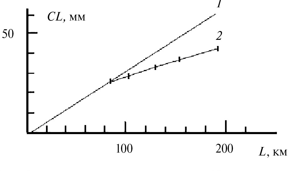 Это места с меньшей плотностью населения и застроек, большими районами с растительностью и водоемами. Измерения проводили летом 2022 г. включая сентябрь и октябрь. Естественно, в зависимости угла наблюдения Солнца первая указанная трасса имела самый большой угол по отношению к горизонту в летние месяцы, а две другие – меньшие углы, поскольку находились азимутально западнее. В осенние месяцы была измерена только первая трасса при малом угле расположении Солнца к горизонту. Погода в летние месяцы была в основном ясная и жаркая со средней температурой воздуха от 23 до 28 °С. В сентябре немного прохладнее, в октябре около 5 °С. За летний период усредненные величины для указанных трасс составили соответственно I/I₀ = 0.733, 0.685 и 0.615, а осажденный слой метана – 26.70, 32.90 и 43.30 мм. Из соотношения (5) получены значения С₀ = 1.90, 1.67, 1.56 ppm соответственно. Обращает на себя внимание тот факт, что осажденные слои метана получились не пропорциональны величинам наклонной дальности (рис. 3).