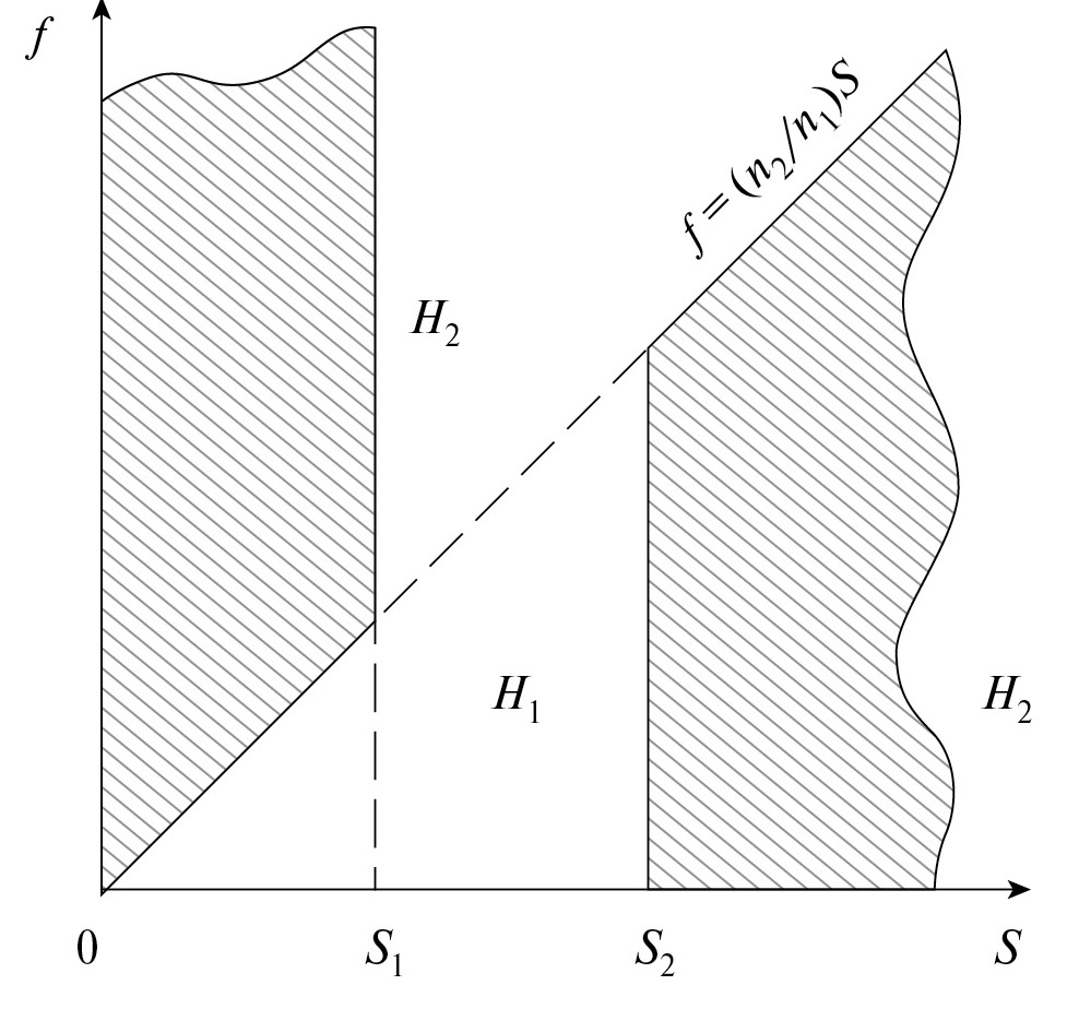 Рис. 2. Области принятия гипотез для оптимального решающего правила; область принятия гипотезы заштрихована.