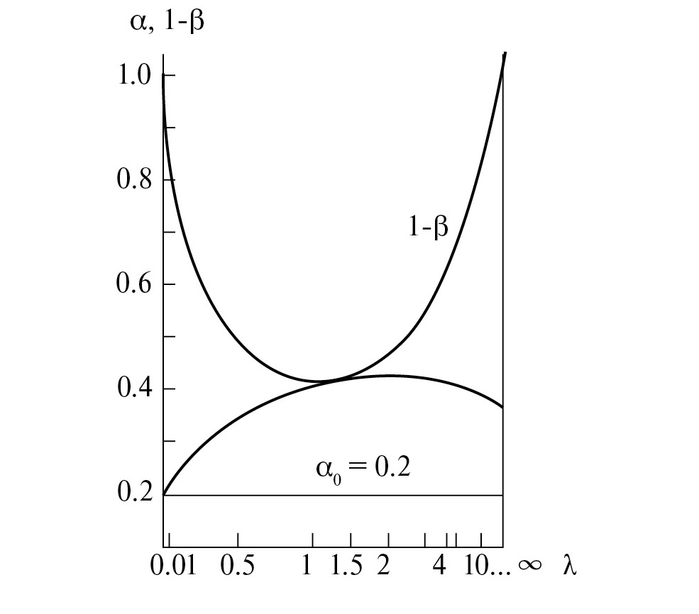 Отметим, что при на оси абсцисс откладывается величина 2 – 1/λ. Ясно, что найденное решающее правило является подобным уровню и несмещенным.