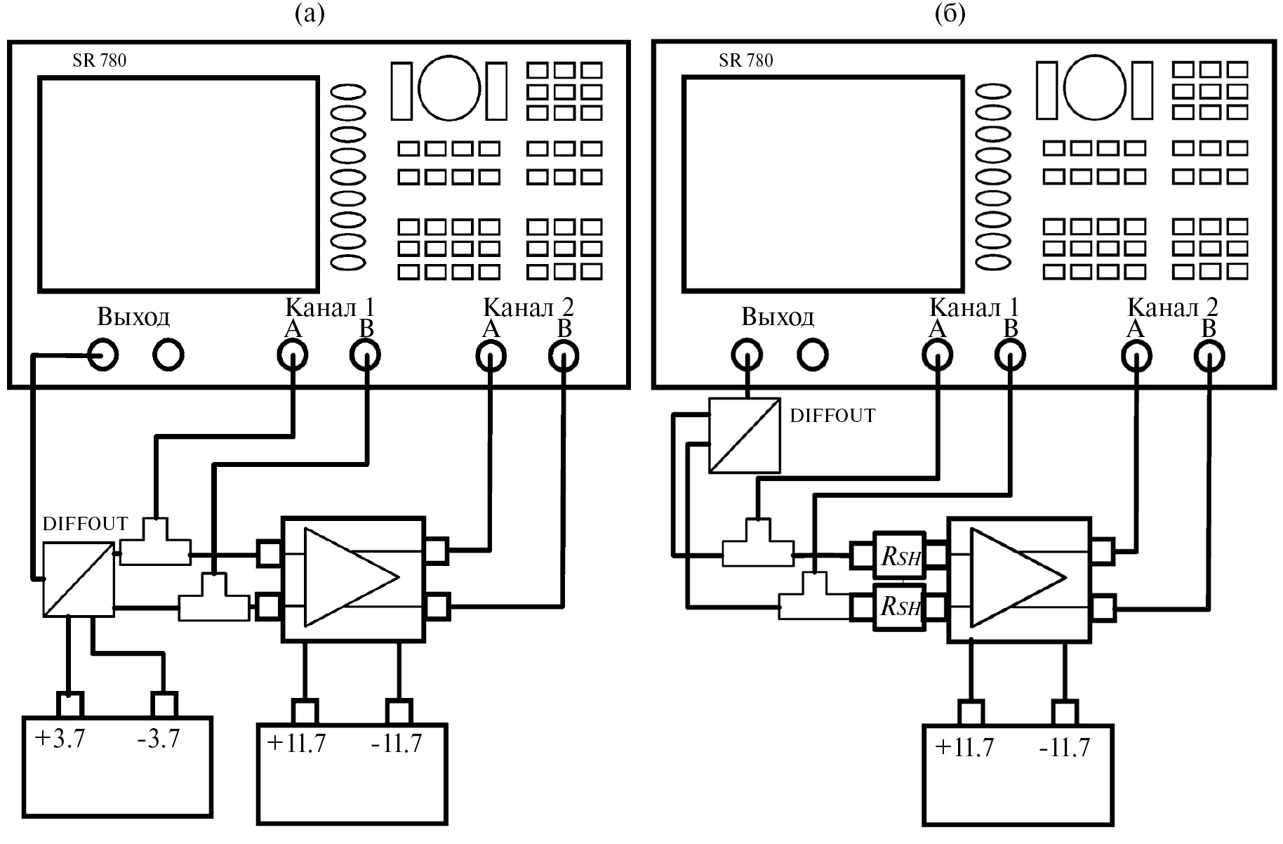 Рис. 2. Схемы измерения коэффициента усиления: а – без шунтирующего резистора для измерения шума напряжения, б – с шунтирующим резистором для измерения шума тока (источник питания дифференциального выходного буфера DIFFOUT не показан).