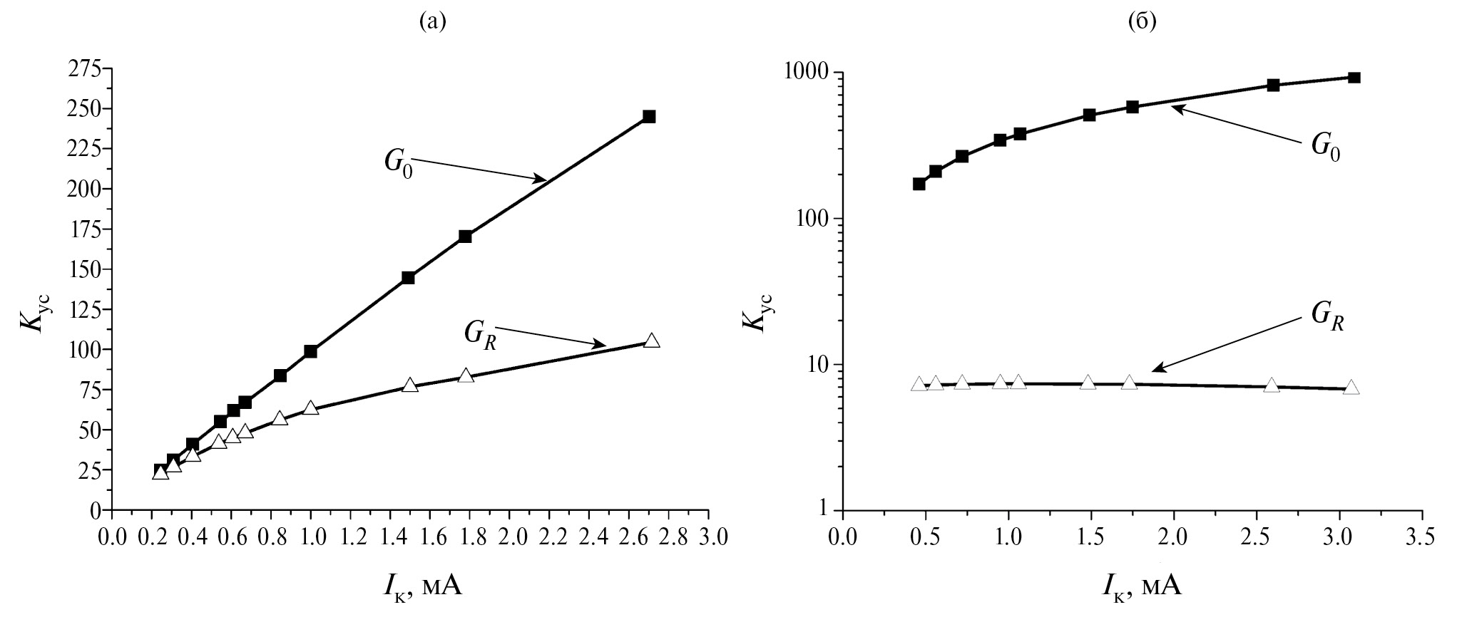 Рис. 4. Зависимости коэффициентов усиления усилителя от тока коллектора при 300 К (а) и 77 К (б).