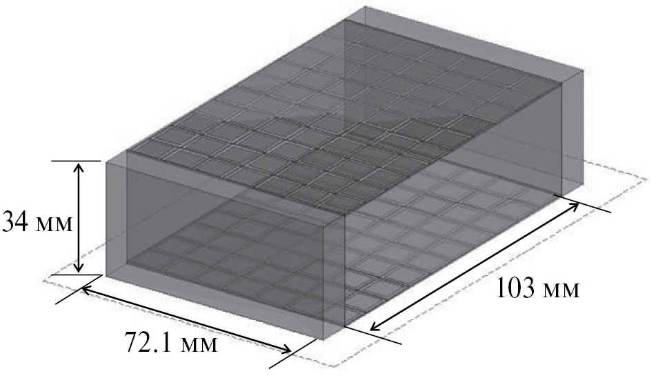 На рис. 6 представлен волновод прямоугольного сечения 72.1 × 34 мм длиной 120 мм, на широкие стенки которого помещен ИМП РП на основе полосно-отражающих решеток первого типоразмера. Толщина диэлектрического слоя между решеткой и стенкой волновода 0.5 мм, его диэлектрическая проницаемость – 10.2, тангенс угла потерь – 0.112. Число элементов решетки на каждой стенке 7 × 10 = 70 (размер решетки 72.1 × 103 мм2).