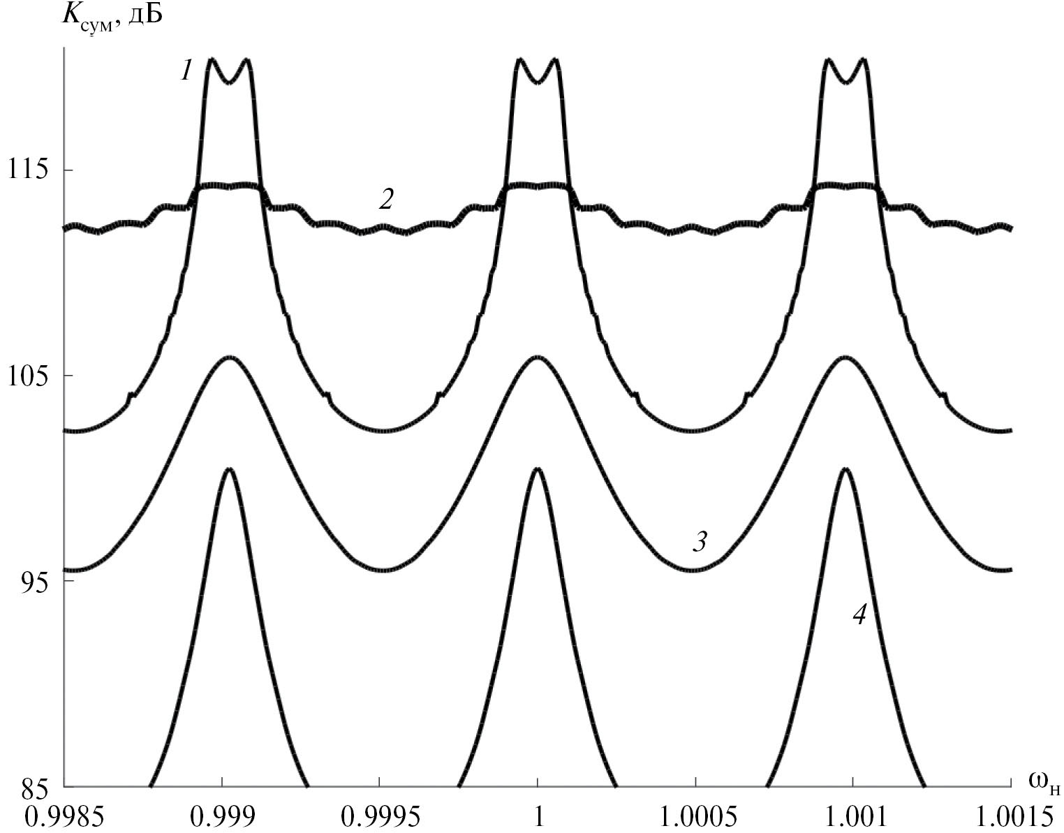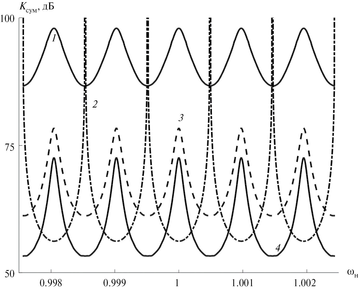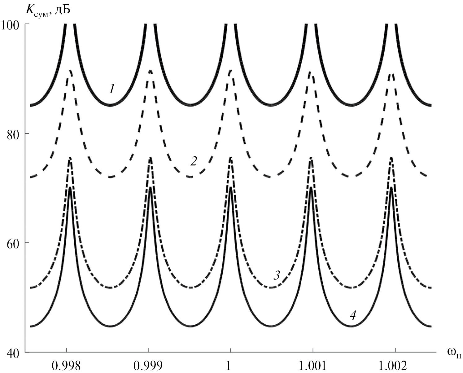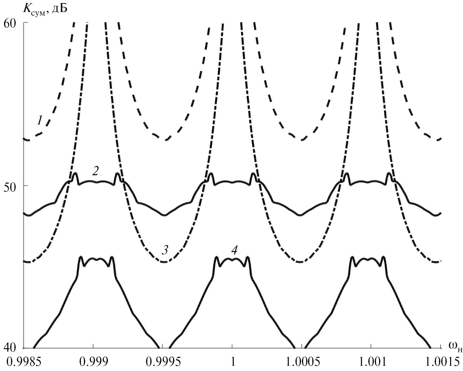 Рис. 3. Зависимости суммарного коэффициента эффективности режекции УП от нормированной частоты; взвешивание реализации ВФ Кайзера: β = 6, Nуд = 50 (1) и 10 (2); β = 5, Nуд = 50 (3) и 10 (4).