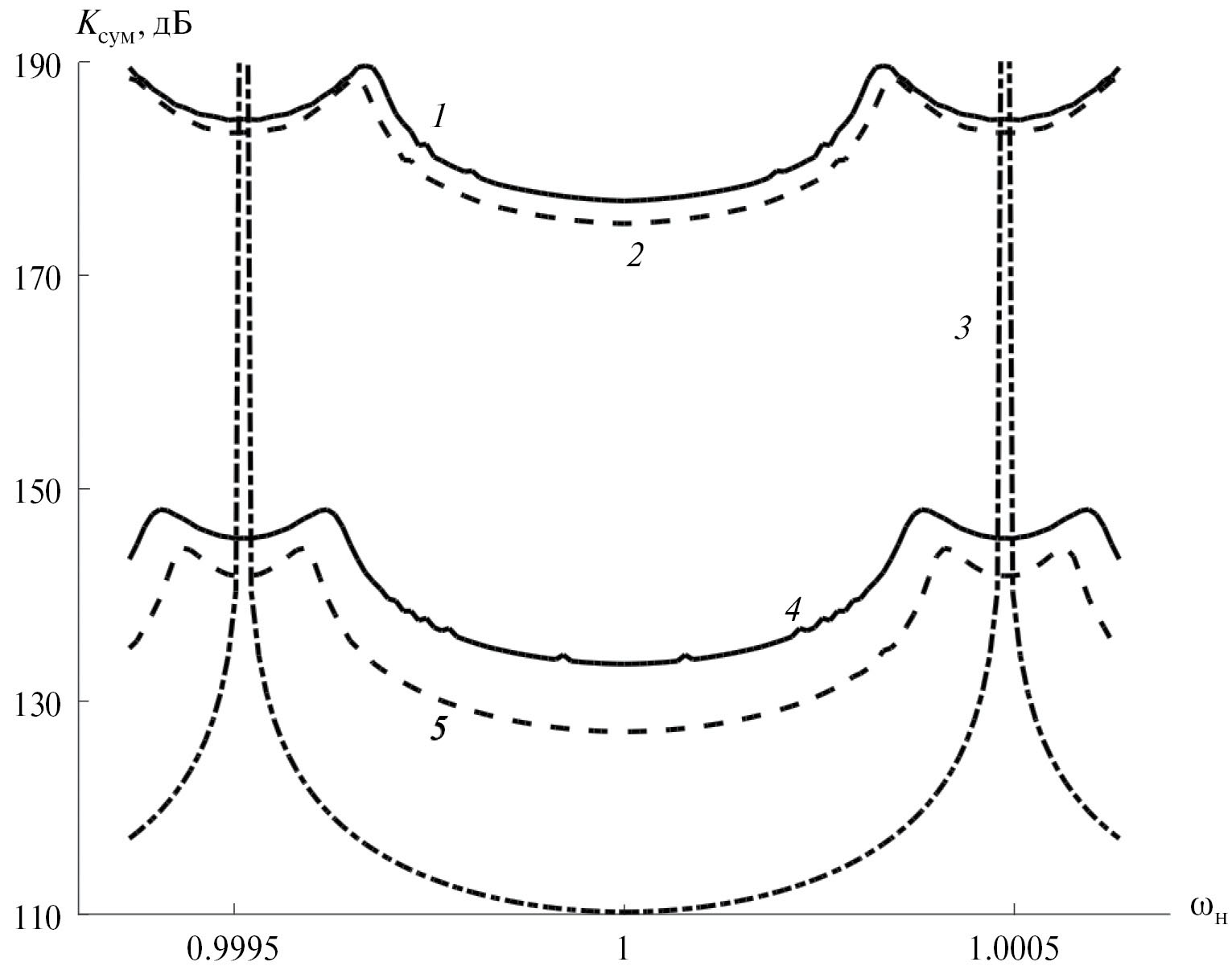 Как видно из рис. 1–5, зависимости суммарного коэффициента эффективности режекции узкополосной помехи от частоты обладают периодическим характером. Форма каждой из зависимостей индивидуальна, однако некоторые тенденции поведения, помимо их периодичности, устойчиво проявляются. Например, из рис. 1 и 2 видно, что зависимости , полученные при взвешивании реализаций помехи ВФ Кравченко и ВФ Дольфа–Чебышева, обладают “квазиколебательным” поведением. Обращают на себя внимание зависимости , полученные при взвешивании реализаций помехи ВФ Кайзера. В этих случаях имеют место умеренные значения , а поведение зависимостей характеризуется “причудливыми” формами (см. рис. 3, кривые 2, 4). Заметно отличающимися особенностями поведения характерны зависимости , полученные при взвешивании помехи ВФ Кравченко–Бернштейна–Рогозинского (см. рис. 4, кривая 1, рис. 5, кривые 1, 2, 4, 5).