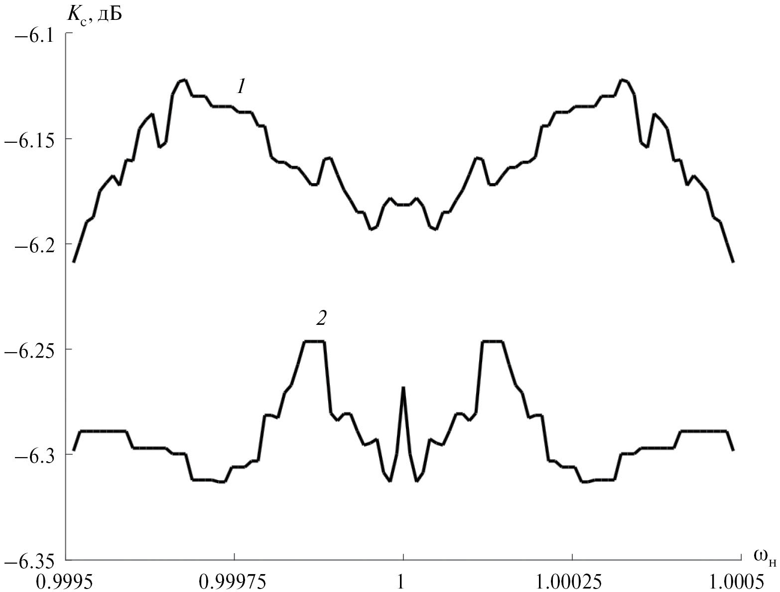 Рис. 6. Зависимости коэффициента прохождения ФМ-СРС от нормированной частоты при удалении Nуд = 50 частотных выборок; взвешивание ВФ ДЧ5(1) и (2).