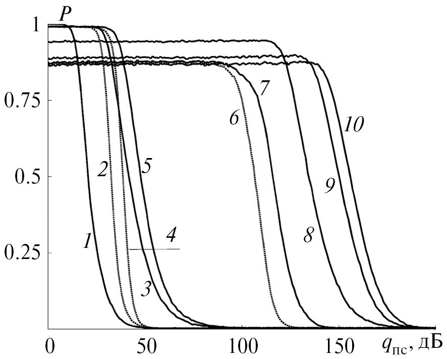 Рис. 8. Зависимости вероятности правильного выполнения поиска по задержке ФМ-СРС, наблюдаемого на фоне УП и шума, от отношения “помеха/сигнал” при qэп = 45 дБГц, M = 1: поиск ФМ-СРС без ЧР (кривая 1); единичная ВФ при Nуд = 10 (2, 3) и 50 (4, 5); ВФ К4ДЧ5 (6,7), ВФ Хеннинга (8), (9), (10) при Nуд = 50; фиксированная частота помехи – 1, 2, 4, 6, случайная – 3, 5, 7 и 8–10.