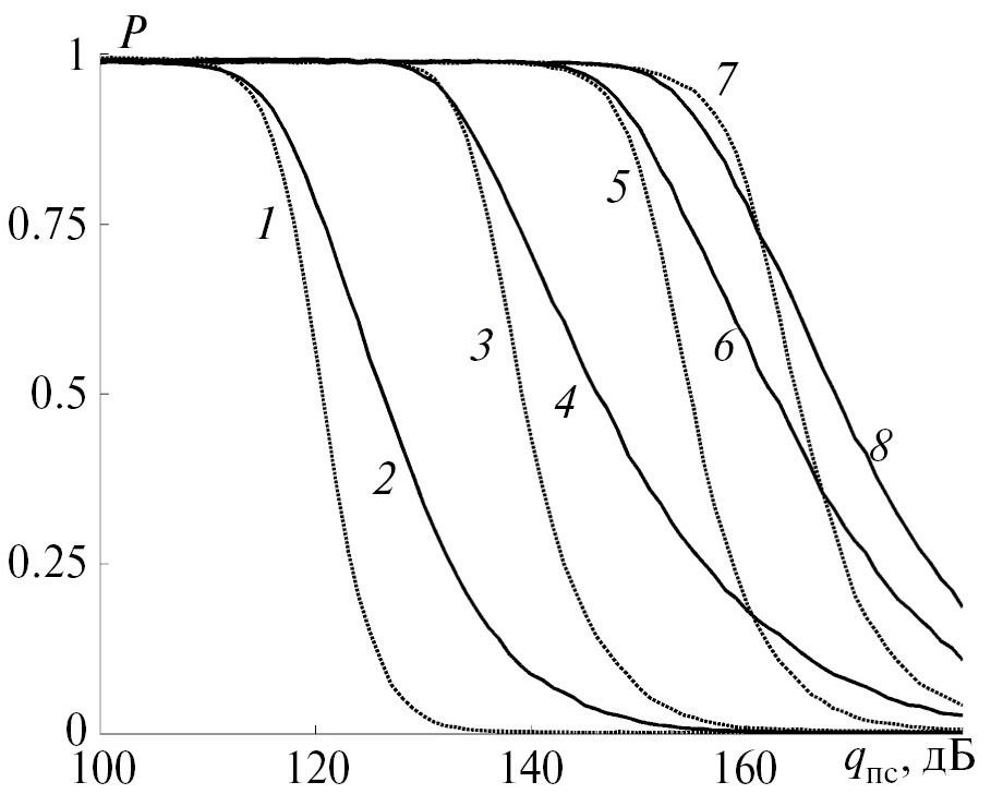 Рис. 9. Зависимости вероятности правильного выполнения поиска по задержке ФМ-СРС, наблюдаемого на фоне УП и шума, от отношения “помеха/сигнал” при qэп = 40 дБГц, M = 5, Nуд = 50: ВФ К4ДЧ5 (1, 2); Хеннинга (3, 4); (5, 6); (7, 8); нечетные кривые соответствуют фиксированной частоте помехи, четные – случайной.