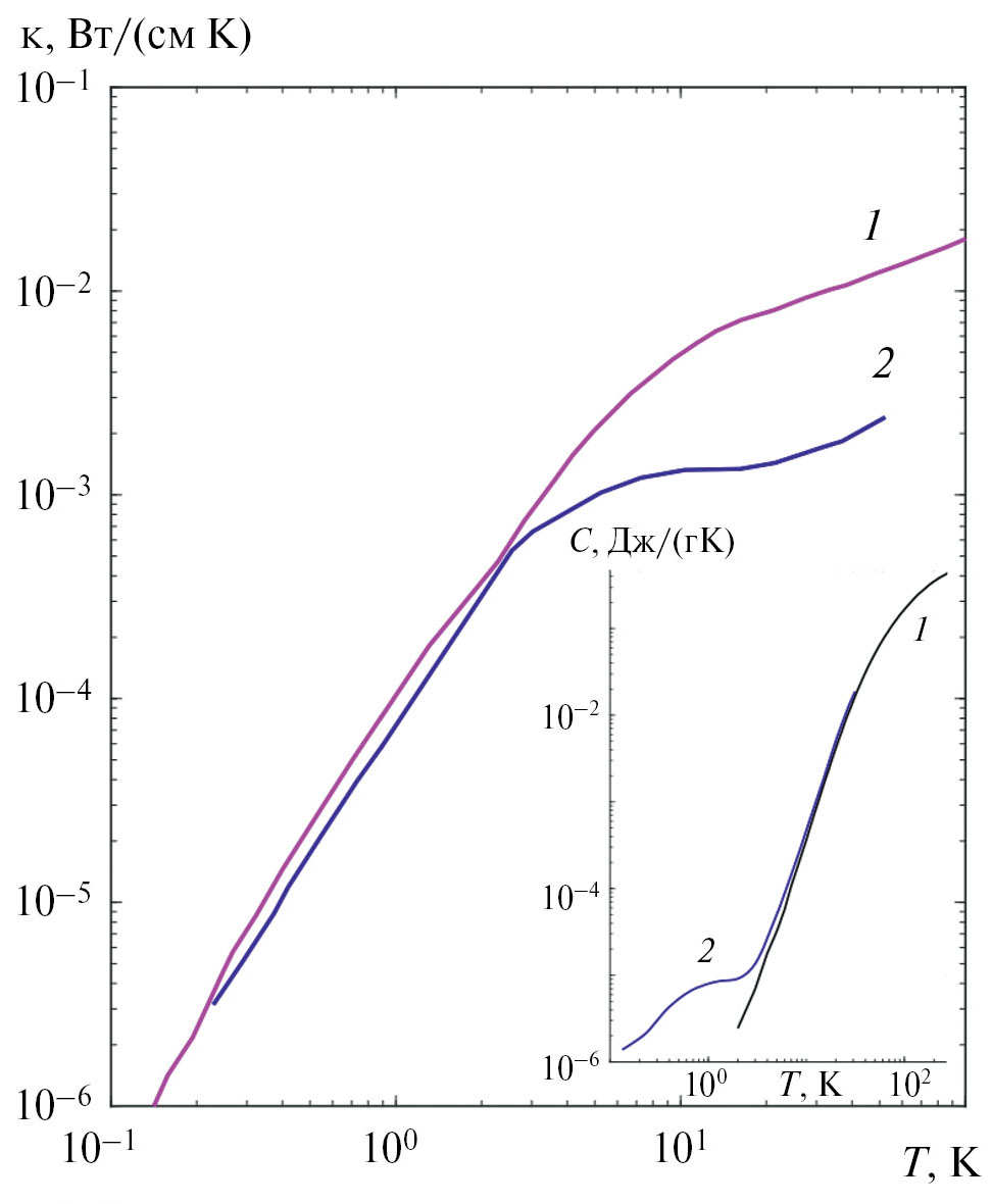 Рис. 2. Зависимости теплопроводности в монокристаллах YSZ 4.5 % (кривая 1) и PMN (2) от температуры, на вставке – зависимости теплоемкости в YSZ 4.5 % [14] (кривая 1) и 5 % (2) от температуры.