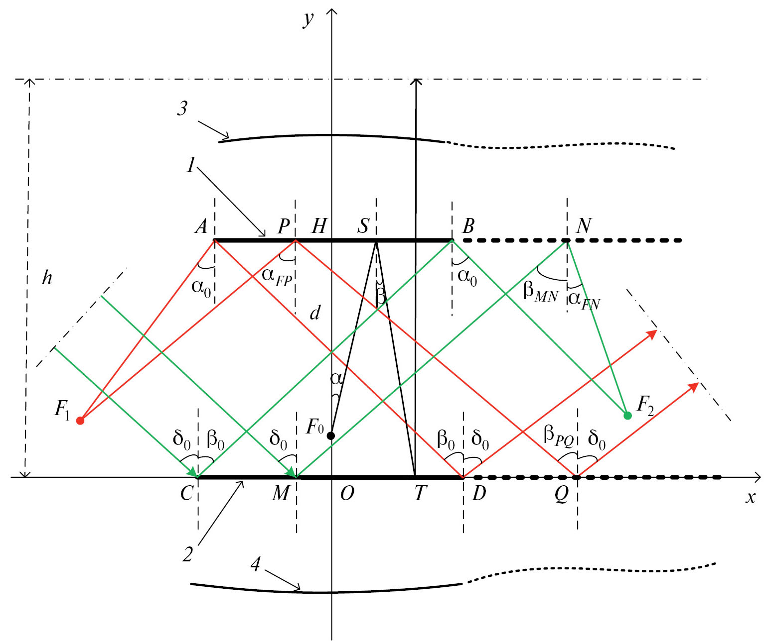 Другой луч, выходящий из точки F0, падает на решетку 1 в точке S, отражается от нее, падает на решетку 2 в точке T и отражается от нее параллельно оси y. При этом его эйконал определяется формулой