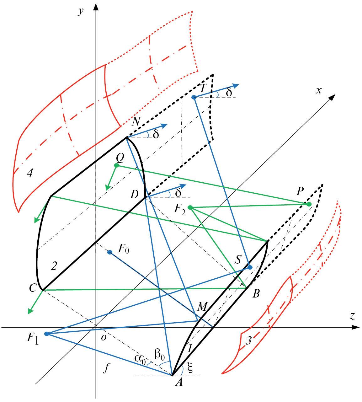 где xA = –x0, yA = d; f — расстояние от края начального участка до фокуса, — угол между осью y и прямой, соединяющей фокус F1 с краем (точкой A) начального участка решетки 1. При этом