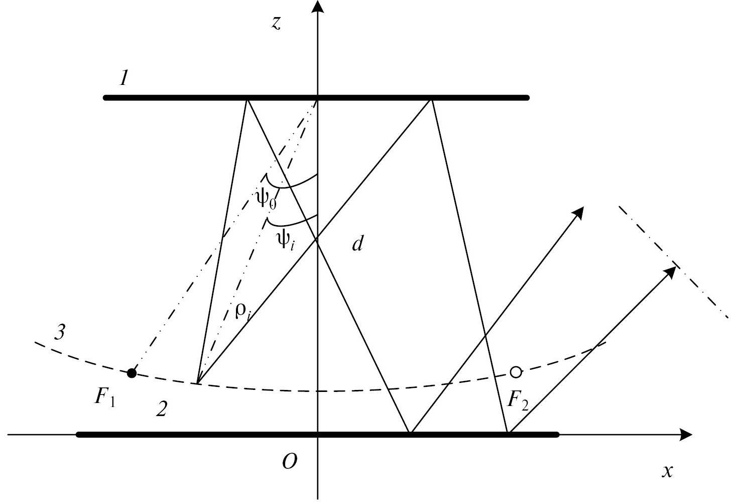 Основная решетка 2 расположена в плоскости XY, а вспомогательная решетка 1 расположена под углом ξ к этой плоскости. При этом плоскость YZ является плоскостью симметрии задачи. При расположении источника сферической волны в двух симметричных относительно этой плоскости фокусах (F1 и F2) с другой стороны бифокальной системы формируются два симметричных относительно плоскости YZ плоских фронта.