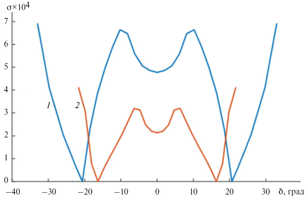 Как видно на рисунке, минимальные значения СКА для первой системы в пределах угла зрения 40° составляют 3.2×10–4, а в пределах угла зрения 65° для второй системы — 6.5×10–4.