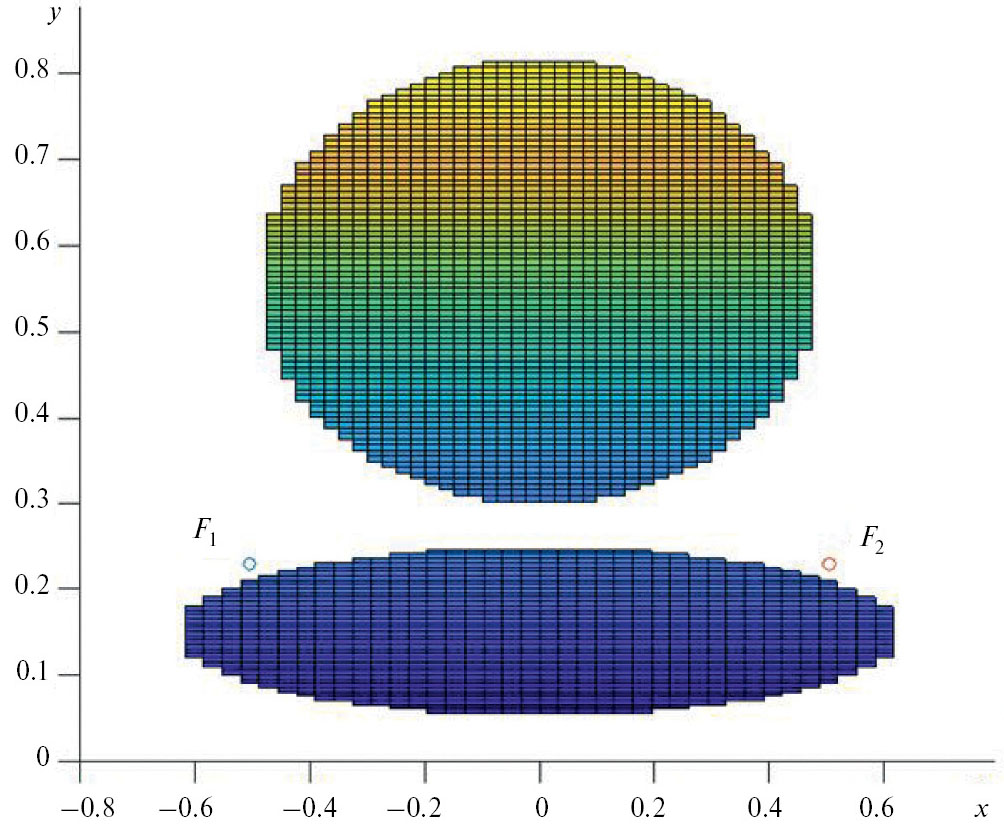 Пусть распределение внесенного эйконала начальным участком решетки 1 имеет вид L10 = ax2+by2, где коэффициент b полагается заданным в начале синтеза. Для определения коэффициента а зададим также параметры: размер 2x0 начального участка решетки1 при y = 0, расстояние f от краев этого участка до фокусов и расстояние f0 от точки фокуса F0 для начальных участков до решетки1. Применяя алгоритм, описанный в разд. 1, находим коэффициент а и координаты точек F1, F2.