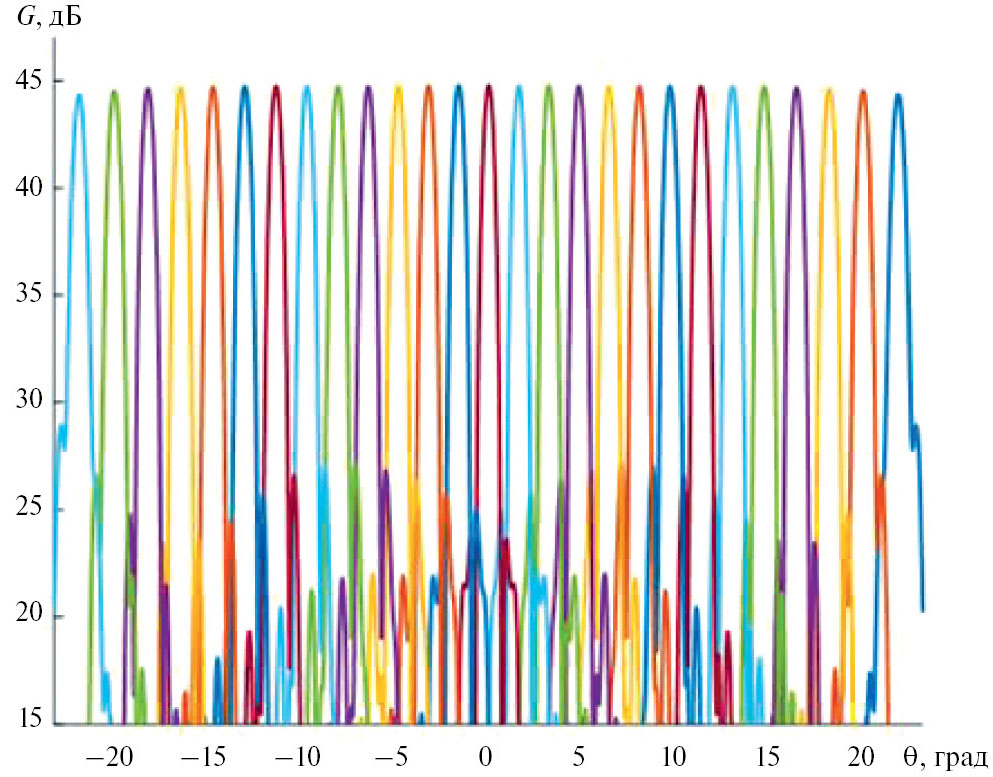 где L — эйконал луча от облучателя до выхода из системы в точке решетки 2 с координатами x, y. Подставляя это выражение в формулу (38) и интегрируя по всей поверхности решетки 2, находим диаграмму направленности бифокальной системы в приближении Кирхгофа. На рис. 7 приведены результаты расчета диаграммы направленности бифокальной антенны с облучателем диаметром 25 мм, габаритами решетки 2, равными 1×0.52 м, f1 = f2 = 0.9862 м, d = 1 м на частоте 24 ГГц при перемещении облучателя по фокальной кривой.