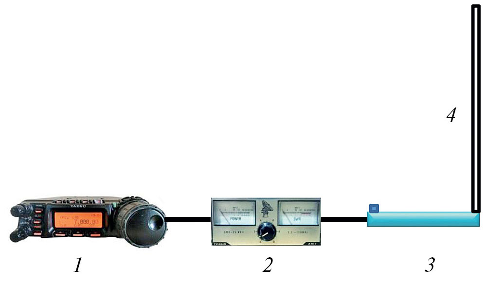 Рис. 1. Схема экспериментального стенда: 1 – передатчик, 2 – измеритель КСВ, 3 – согласующая линия, 4 – газоразрядная лампа.