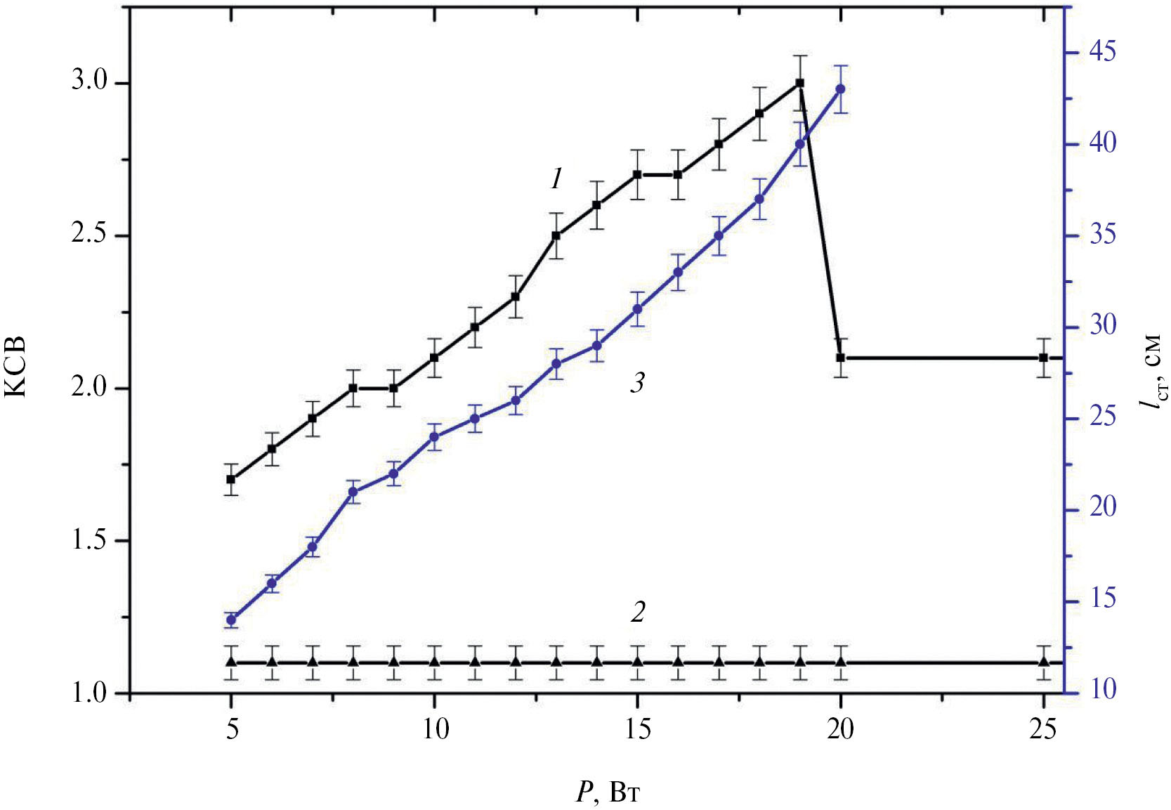 Рис. 2. Зависимость КСВ (1, 2) и длины плазменного столба (3) от мощности передатчика на частоте 140 МГц; 1 – люминесцентная лампа, 2 – штыревая антенна.