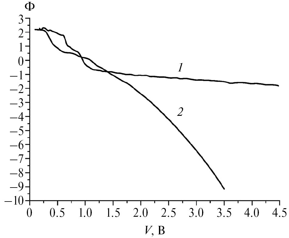 где — полевое напряжение, , нормировочное значение тока Максимальные напряжения, при которых фиксировался ток, составили для ветвей обеднения и обогащения кремния соответственно = 4.5 и 3.5 В. Фактически функции рассматриваются как аналог показателя экспоненты в квантово-механической вероятности туннелирования сквозь барьер, поэтому возникает знак минус перед логарифмом. Как следует из выражения (1), информация о рельефе потенциала в изолирующем слое содержится в производных от функций . Поэтому, а не только из необходимости избавиться от привязки к нормировочному значению тока , требуется вычислить зависимости и . Поскольку (см. рис. 1) экспериментальные данные зашумлены, для взятия производных нужно использовать метод регуляризации Тихонова [13]. В соответствии с [14] для сглаживания по Гауссу имеем
