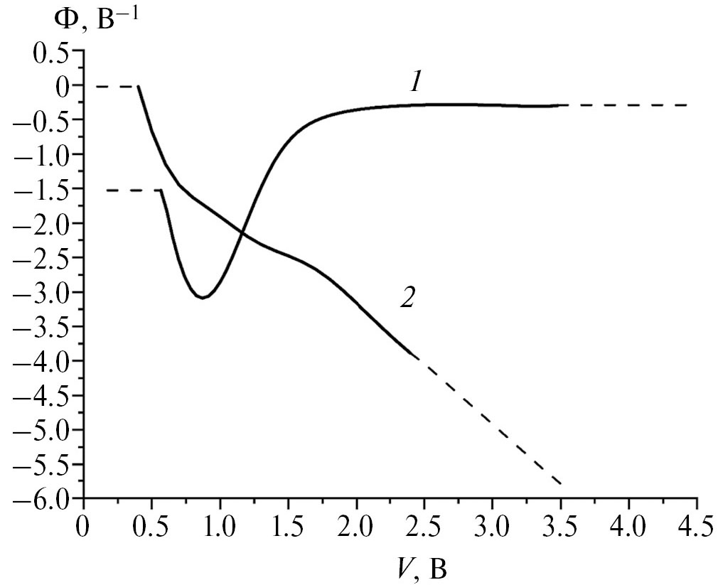 Рис. 2. Производные от экспериментальных зависимостей логарифма туннельного тока от напряжения: 1 — ветвь ВАХ, отвечающая обеднению полупроводника, 2 — ветвь ВАХ, отвечающая обогащению полупроводника; пунктиром отмечены области вблизи минимального и максимального напряжений, построенные интерполяцией результатов из близлежащих “надежных” интервалов.