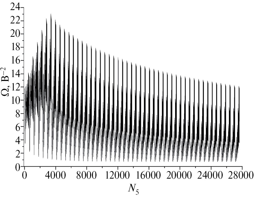 Рис. 3. Зависимость функционала Ω от номера пятерки N5 параметров модельного трапецеидального потенциала для для m0/m =1.8