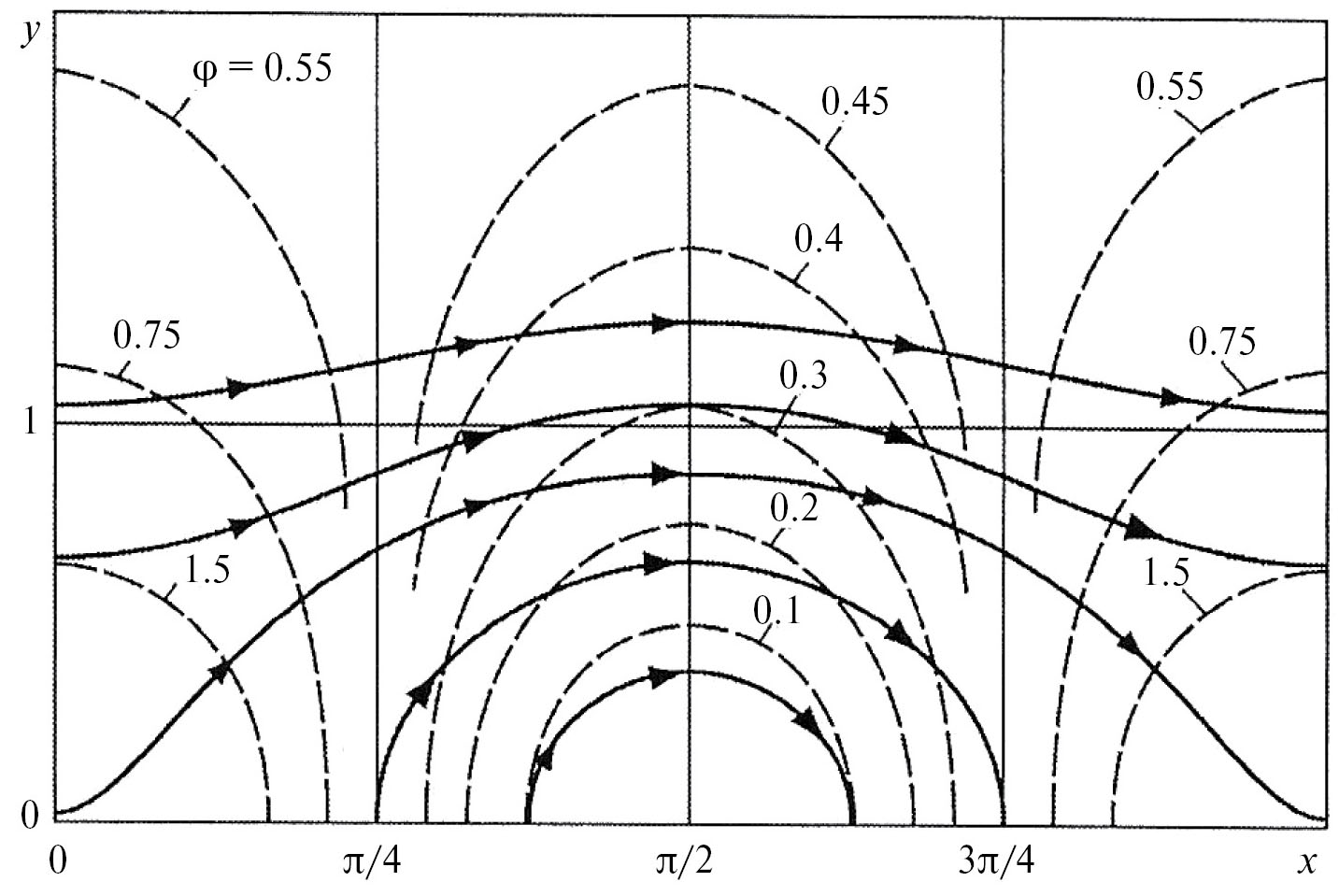 Рис. 1. Течение с траекториями-окружностями с полуплоскости ψ = 0, ρ-режим.
