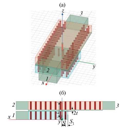 Соответствующая электромагнитная модель для численного исследования характеристик перехода была составлена на основе программы HFSS (https://ansys.com) и показана на рис. 2. Данная модель позволяет рассчитать полную 3×3 S-матрицу перехода. Так как целью данной работы является исследование характеристики согласования перехода по порту 1, то ниже будем строить и обсуждать только характеристику S11. Прошедшая на верхний слой мощность делится практически поровну между двумя выходными портами, и в идеальном случае отсутствия потерь коэффициент передачи в каждый из портов 2 и 3 должен составлять S21 = S31 = –3 дБ. Также в силу взаимности структуры и пренебрежимо малых тепловых потерь коэффициенты передачи между боковыми портами 2 и 3 и коэффициенты отражения от них равны –6 дБ [15]. Все металлические поверхности в модели предполагаем идеально проводящими. Вход и выходы EBG-волноводов на каждом слое стыкуются со стандартными прямоугольными металлическими волноводами.