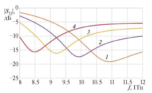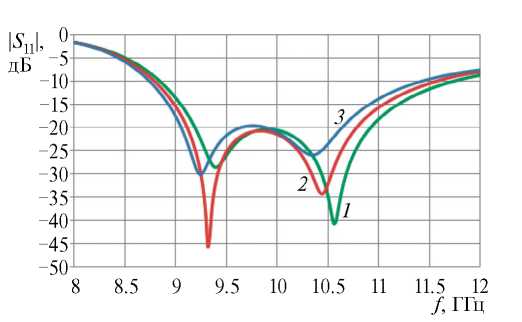 В дополнение на рис. 11 представлены зависимости коэффициента отражения для разных значений величины L1, характеризующей длину зонда на нижнем слое, при фиксированных других параметрах, а на рис. 12 показан коэффициент отражения для разных значений величины L2 — длины зонда на верхнем слое при фиксированных других параметрах. Из рис. 10–12 видно, что значения N = 0.7, L1 = 6.5 и L2 = 8, которым соответствуют кривые 2 на этих рисунках, можем считать оптимальными по критерию наилучшего и сбалансированного согласования в центральной части диапазона от 9 до 11 ГГц. В данном случае критерием сбалансированности согласования может служить достаточно симметричная форма кривой и ширина полосы согласования по уровню –20 дБ.
