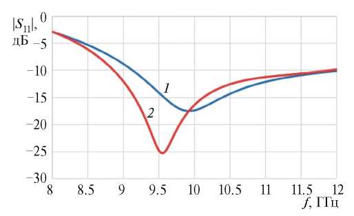 Мы видим, что в обоих случаях характеристика согласования в исследуемом диапазоне частот имеет один минимум и достаточно узкую полосу частот по уровням согласования ниже –10 дБ. Сравнивая с характеристикой согласования для межслойного перехода в [14], можем предположить, что отсутствие второго минимума для рассматриваемого перехода с делением мощности объясняется отсутствием на верхнем слое резонансной области, взаимодействующей с резонансной областью на нижнем слое.