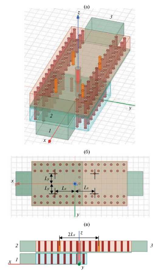 Рис. 7. Модель структуры перехода с дополнительными согласующими стержнями на верхнем слое: (а) — общий вид; (б) — вид сверху, (в) — вид сбоку; 1–3 — номера портов.