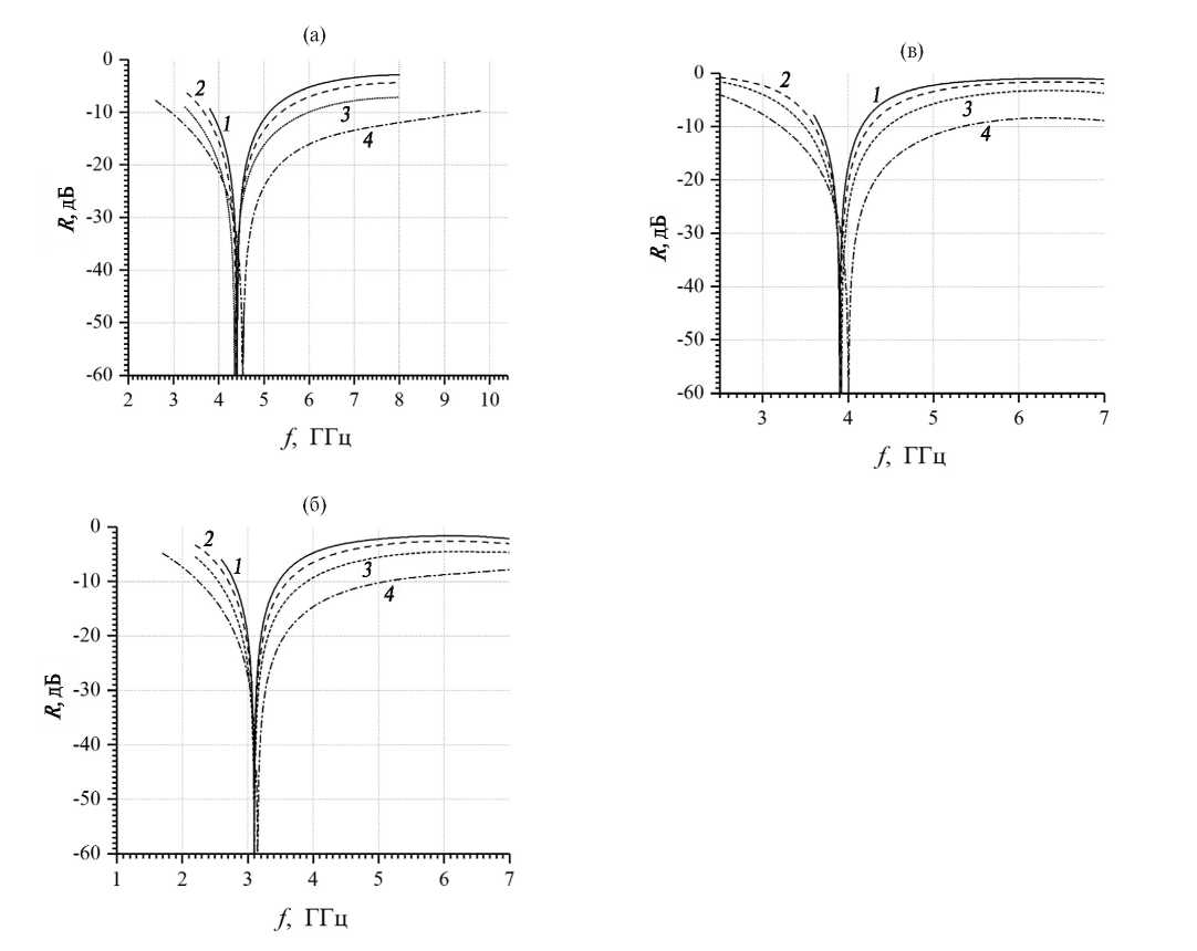 Для каждого угла падения подбиралась величина тангенса угла диэлектрических потерь tgδ, при которой уровень отражения <–50 дБ. Из рис. 3а–3в и табл. 1 следует, что с увеличением угла падения полосы поглощения быстро расширяются без заметного изменения резонансной частоты. Полосы поглощения также расширяются при увеличении толщины слоя диэлектрика с потерями. Так, полосы поглощения РПП из табл. 1 при угле падения 85° существенно превышают октаву.