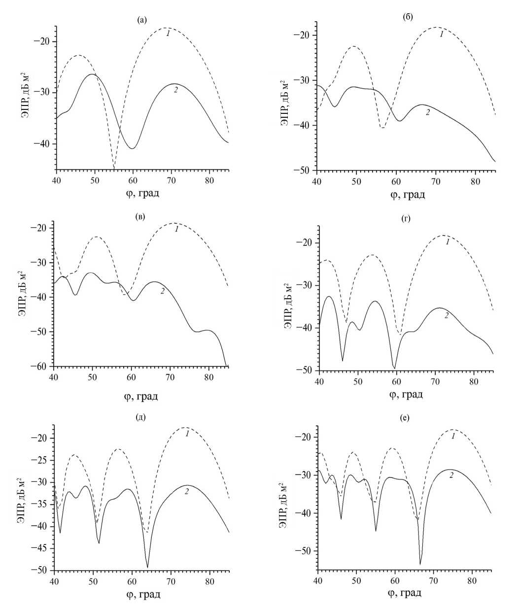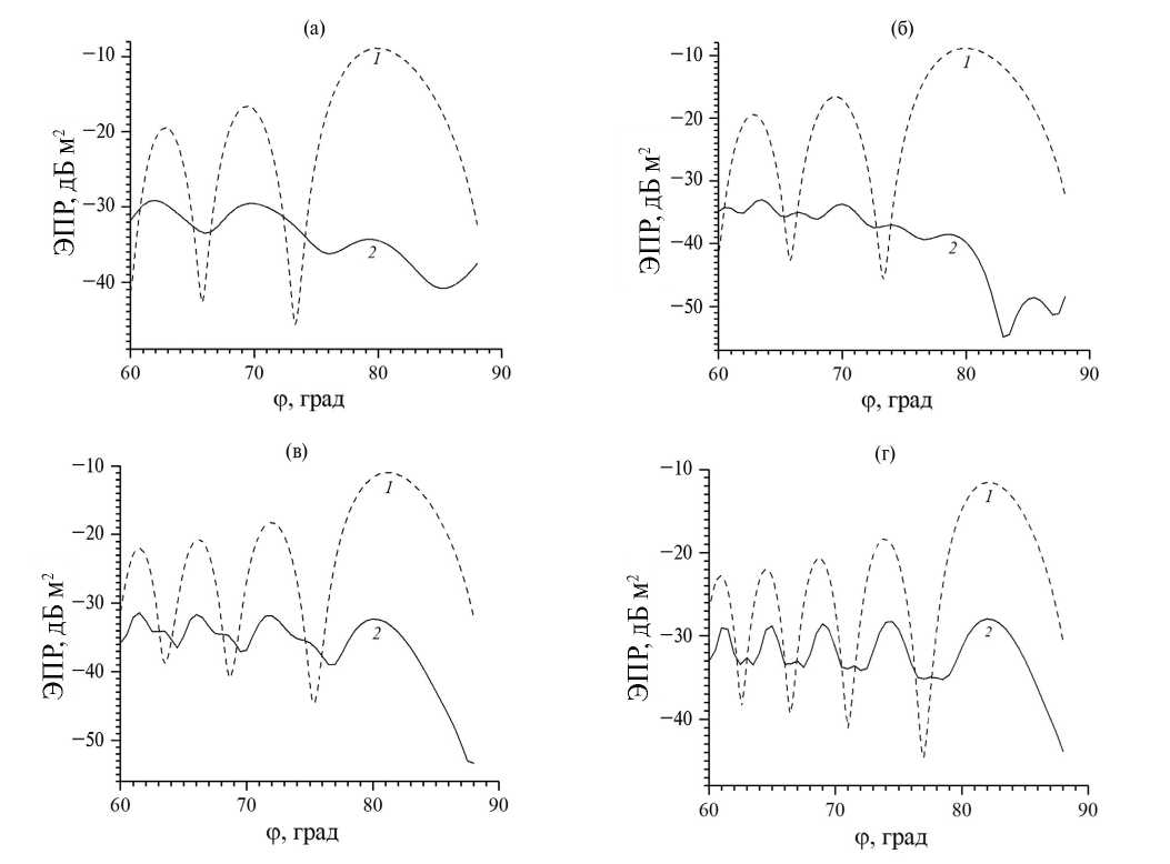 Сравнение частотно-угловых характеристик обратного рассеяния от металлических пластин с РПП и без РПП длиной 412, 2060 и 6180 мм в угловых интервалах 40°…90°, 60°…90°, 70°…90° соответственно и в частотных диапазонах порядка октавы показало существенное снижение обратного рассеяния от пластины с РПП в этих угловых интервалах и частотных диапазонах. Так, РПП толщиной 1 мм на металлической пластине длиной 6180 мм снижает первый максимум обратного рассеяния на частотах 3, 4, 5 и 6 ГГц с –3 дБ м2 до — 36 дБ м2, с –5 дБ м2 до –44 дБ м2, с –7 дБ м2 до –36 дБ м2 и с –6 дБ м2 до –34 дБ м2 соответственно. При этом все остальные максимумы в интервале углов 70°…90° снижаются приблизительно до уровня –30 дБ м2.