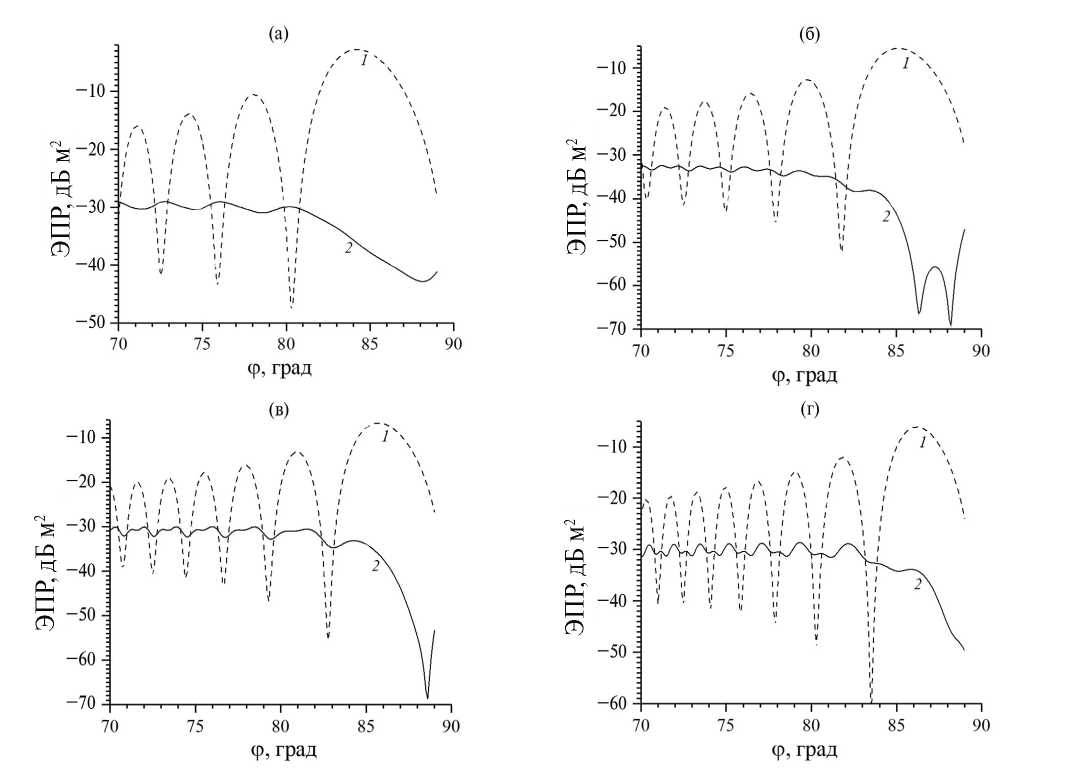 Угловые зависимости обратного рассеяния от протяженных гладких поверхностей конечных размеров при падении на них плоских TM-волн описаны, например, в [1] и [9]. Эти зависимости носят интерференционный характер: чередующимися максимумами и минимумами уровня обратного рассеяния. При этом первый со стороны больших углов максимум отличается от соседних бо́льшими шириной и высотой. Согласно рекомендациям [1] обратное рассеяние может быть подавлено путем нанесения на протяженную металлическую поверхность тонкого слоя материала, поглощающего поверхностные токи. Так, в работе [9] показано, что слой магнитодиэлектрика толщиной 0.5 мм со сравнительно небольшими электрическими и магнитными потерями на протяженной металлической поверхности снижает на 5 дБ уровень первого максимума на угловой зависимости обратного рассеяния. Также было показано, что основной вклад в снижение обратного рассеяния вносят потери магнитного типа.
