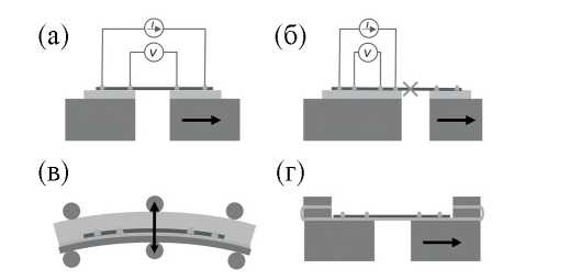 Рис. 1. Методы создания одноосной деформации, использовавшиеся в данной работе: а, б — методы контролируемого удлинения образца; в — метод изгиба подложки; г — метод растяжения подложки с закрепленным образцом.