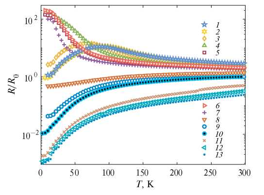 На рис. 4 приведены температурные зависимости нормированного сопротивления R(T)/R0(Т) образцов при различной величине и знаке деформации, полученные с помощью различных методик. Измерения проводили четырехконтактным методом. Величину деформации ε мы оценивали по величине ΔR/R0. Видно, что рост ε приводит к кардинальному изменению вида температурных зависимостей R/R0(Т). А именно: металлический характер проводимости при нулевой деформации (кривая 10), а также при деформациях сжатия (кривые 11–13) сменяется по мере растяжения диэлектрической зависимостью (кривые 1–7).