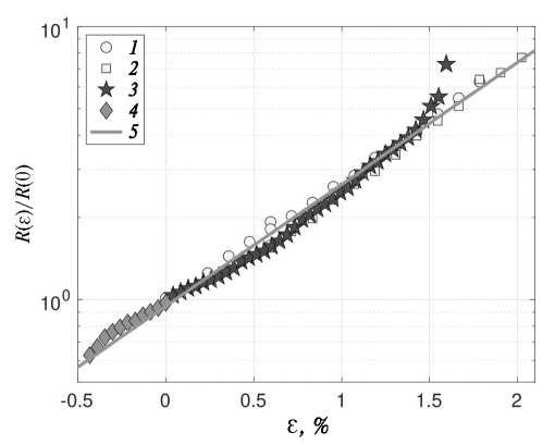 Для сравнения на том же рисунке представлены результаты, полученные при прямом измерении величины деформации (данные рис. 3). Видно, что в области положительного знака деформации зависимости практически совпадают и что смена знака деформации практически не изменяет характера зависимости R(ε). Это подтверждает применимость метода изгиба для количественного измерения деформации любого знака. В целом в пределах погрешности кривая описывается простым уравнением