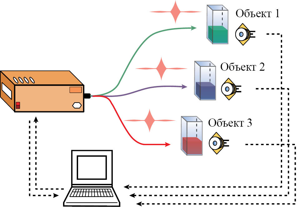 Многоканальные фурье-спектрометры позволяют проводить комплексные спектральные исследования объекта. Использование систем зондов с оптоволокнами разных спектральных диапазонов позволяет одновременно вычислять спектр пропускания, спектр нарушенного полного внутреннего отражения (НПВО) и спектр отражения. Данные приборы могут применяться в различных отраслях промышленности, в первую очередь на технологических линиях для одновременного и непрерывного контроля за ключевыми участками производственного процесса. Известны спектрометры, которые решают эту задачу переключением прибора с одного зонда на другой. Существует единственный многозондовый фурье-спектрометр модели MATRIX-F, предназначенный для измерений в ближнем ИК-диапазоне в режиме реального времени. Этот прибор оснащен шестью зондами, которые можно переключать, измеряя последовательно шесть различных объектов, однако такие приборы не могут обеспечить проведение непрерывных и одновременных спектральных измерений всех выбранных объектов. Общая схема построения многоканального спектрометра приведена на рис. 1.