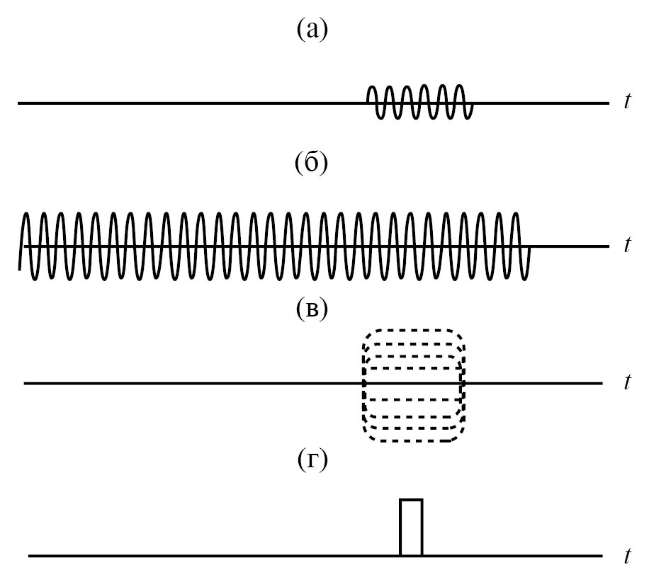 Рис. 3. Осциллограммы: а – импульс, прошедший через АЭ; б – сигнал гетеродина, в – видеоимпульс с выхода фазового детектора при изменении фазы принятого сигнала, г – строб-импульс.