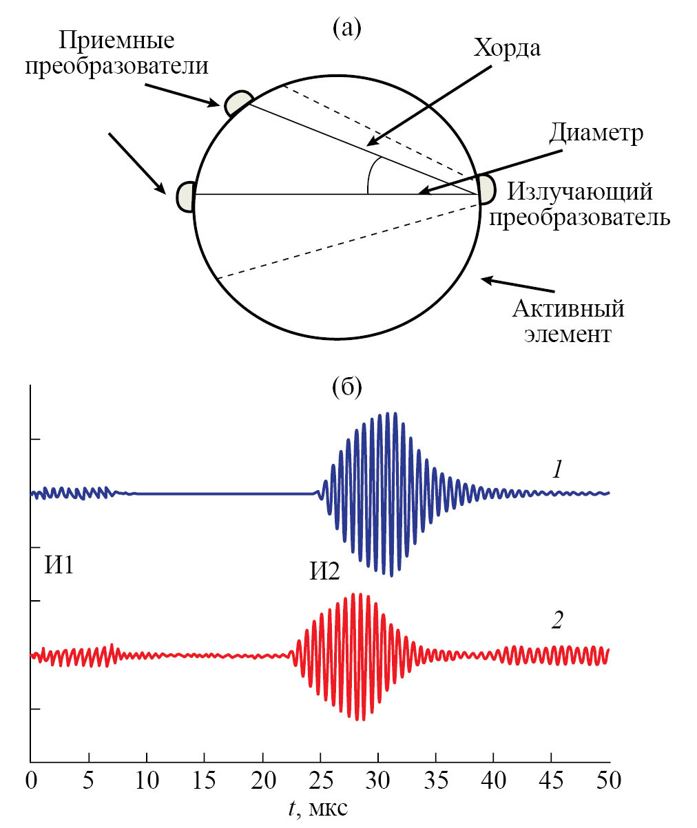 Рис. 8. Схема зондирования АЭ в поперечном сечении (а) и осциллограммы УЗ-сигналов при зондировании продольной волной (б): первый импульс, И1 – зондирующий (просачивание в приемник), второй, И2 – прошедший через диаметр АЭ (1) и через хорду (2).