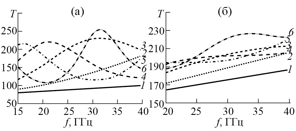 Рис. 1. Спектры радиояркостной температуры собственного излучения плоской поверхности воды (1) и плоского слоя нефти на воде при h = 1 (2), 2 (3), 3 (4), 5 (5) и 6 мм (6) при горизонтальной (а) и вертикальной (б) поляризациях; термодинамическая температура воды 293 К.