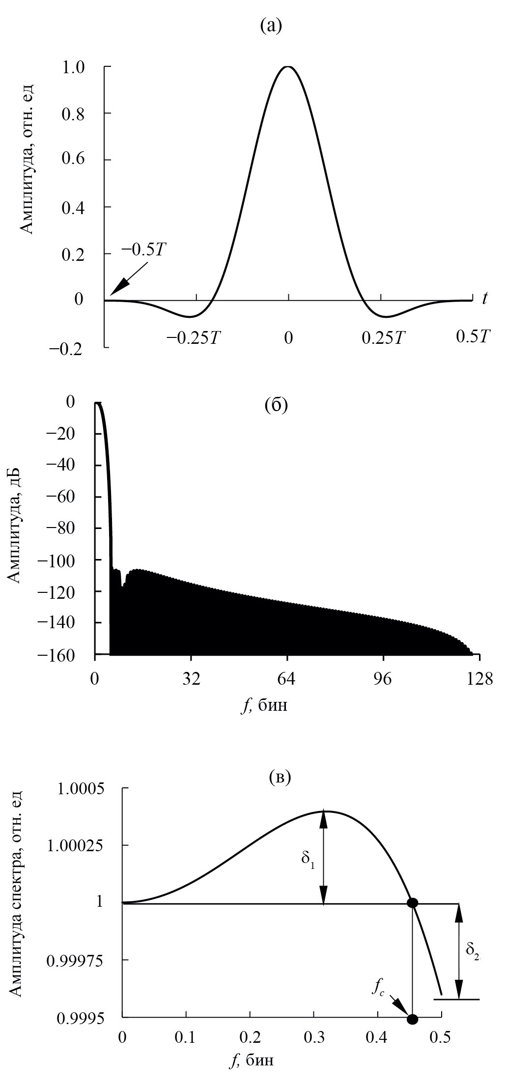 На рис. 1 показана характерная весовая функция с плоской вершиной, полученная по описанному методу. Для рисунка использована оптимальная косинус-полиномиальная весовая функция со следующими параметрами: порядок m = 4, отрезок оптимизации Ω = [β, 0.5N], β = 5.5, скорость спада боковых лепестков V = 12 дБ/окт, число выборок для рисунка выбрано равным N = 256. В результате синтеза получены следующие характеристики: ошибка на интервале уплощения δ = 0.04%, уровень максимального бокового лепестка P = –106.6 дБ. Рис. 1а иллюстрирует вид функции во временной области. Характерной чертой функций с плоской вершиной является наличие областей с отрицательным значением функции, что является необычным для классических весовых функций [1, 2]. На рис. 1б приведен спектр функции в положительной части спектра, при отрицательных частотах спектр отображается зеркально; на рис. 1в представлен в крупном масштабе спектр на отрезке уплощения  бин, показаны также введенные выше параметры δ1, δ2, fc.