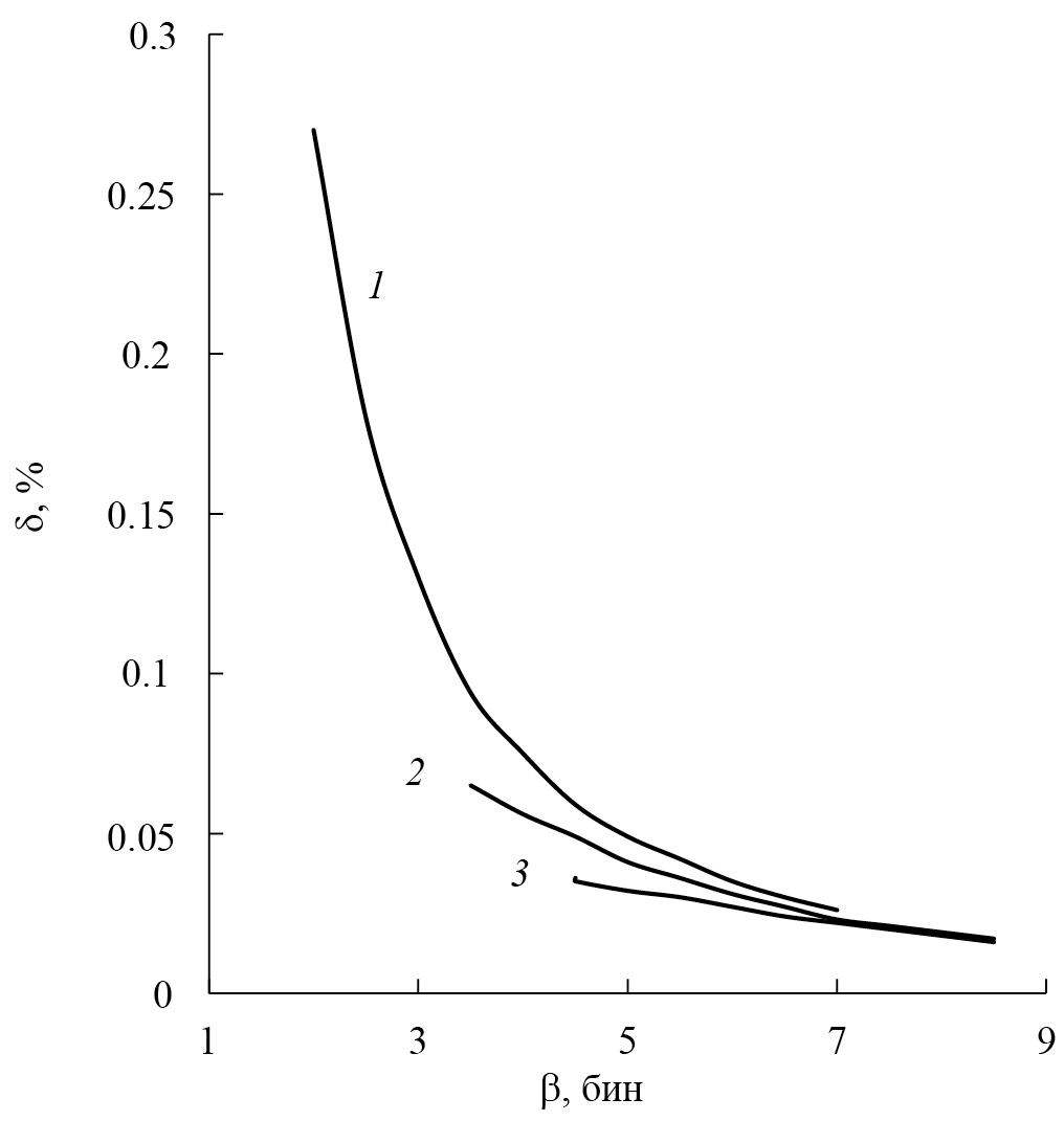 3. Fig. 2. Dependence of the error δ at the flattening interval on the synthesis parameter β for optimal cosine-polynomial functions with side lobe decay rates of 6 (1), 24 (2), and 36 dB/oct (3).