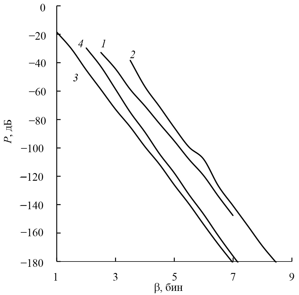 4. Fig. 3. Dependences of maximum side lobe levels on the segment [β, N / 2] bin on the parameter β for optimal weight functions with a flat top (1, 2) and without this property (3, 4) for side lobe decay rates of 6 (1, 3) and 24 dB/oct (2, 4).