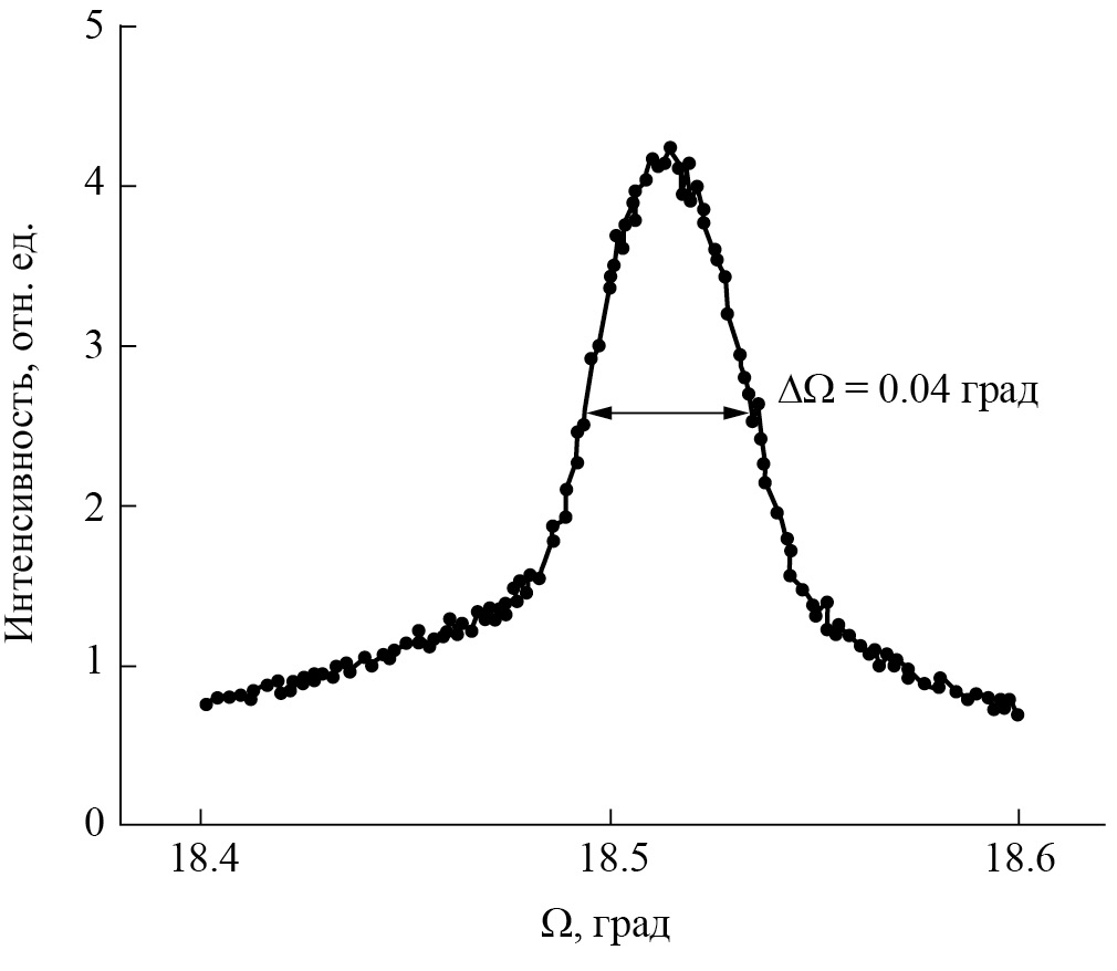 Выращенные пленки были исследованы методом рентгеноструктурного анализа на автоматизированном двухкристальном дифрактометре ДРОН-3, работающим по схеме Брэгга–Брентано. Для выделения характеристической линии Kα1 использовали кварцевый монохроматор. Качество полученных пленок определяли по полуширине кривой качания для плоскости (111). Наши исследования показали, что снижение тока разряда с 200 до 100 мА позволяет реализовать более равновесный процесс осаждения NiO и, как следствие, получать кристаллически более совершенные пленки. Самый кристаллически совершенный образец получен при токе разряда I = 100 мА. На рис. 1 представлена кривая качания от плоскости (111) NiO для этого образца с толщиной эпитаксиальной пленки NiO 300 нм. При этом полуширина кривой качания для плоскости (111) составляет ∆Ω = 0.04° при соотношении реакционной смеси Ar–50%, O2–50%, тогда как при токе разряда I = 200 мА и таком же соотношении компонентов реакционной смеси полуширина кривой качания составляет уже ∆Ω = 0.09°. Также было установлено, что использование реакционной смеси с O2–100% значительно снижает кристаллическое совершенство осажденных пленок NiO. Полуширина кривой качания составляет в этом случае 0.3°. Таким образом, были найдены оптимальные условия напыления пленок NiO для достижения их высокого кристаллического совершенства.