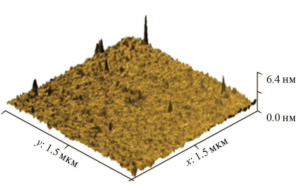 Поверхность исходных подложек LiNbO3 и выращенных на них пленок NiO была исследована на атомно-силовом микроскопе (АСМ) Smart SPM (АИСТ-НТ). На рис. 2а, 2б представлены 2D- и 3D-топографические ACM-изображения фрагмента поверхности полупроводниковой структуры NiO/LiNbO3 c толщиной эпитаксиального слоя NiO 50 нм. Среднеквадратичная высота неровностей на площадке 1.5 × 1.5 мкм2 RMS = 1.73 нм была определена из анализа изображения при использовании программы Gwyddion. С увеличением толщины выращенной пленки NiO среднеквадратичная высота неровностей эпитаксиального слоя увеличивалась за счет накопления количества дефектов вследствие ионной бомбардировки поверхности. Так, при толщине пленки 200 нм она уже составляла RMS = 2.97 нм. Для сравнения шероховатость поверхности пленки при термическом распылении порошка NiO составила RMS = 5 нм при толщине пленки NiO 100 нм [2].