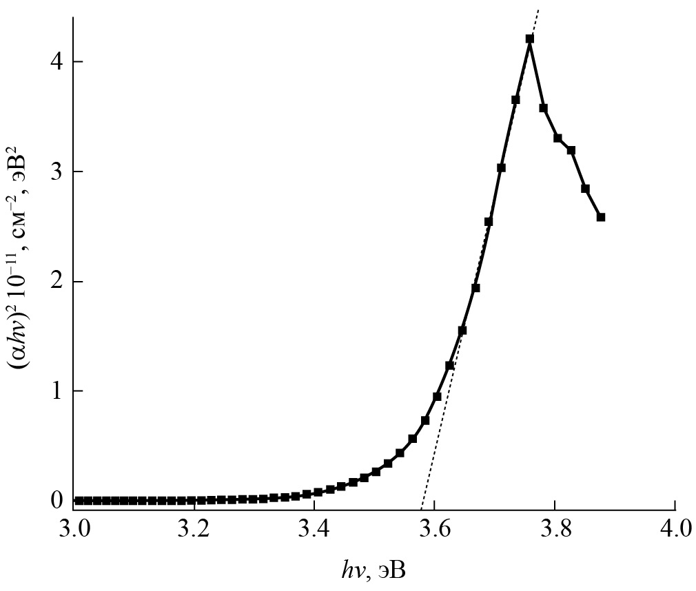 где hν – энергия фотона, Eg – ширина запрещенной зоны, A – постоянная, α – коэффициент поглощения. Построив график (αhν)2 = f (hν) (рис. 5) и экстраполируя линейный участок к точке пересечения с осью hν, можно определить Eg в осажденных пленках. Найденные значения края поглощения для прямых разрешенных переходов для всех исследуемых нами структур лежат в диапазоне 3.57 … 3.59 эВ, что хорошо согласуется с результатами, опубликованными в работах [1, 13, 19].
